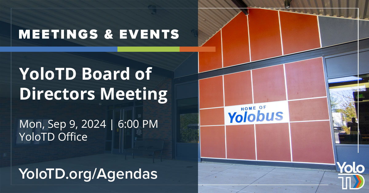 The YoloTD Board of Directors is scheduled to meet on Sep 9, 2024 at 6:00 PM. The meeting will be held in person at the YoloTD office located at 350 Industrial Way, Woodland, CA 95776. Members of the public may also participate in-person or virtually via Zoom.