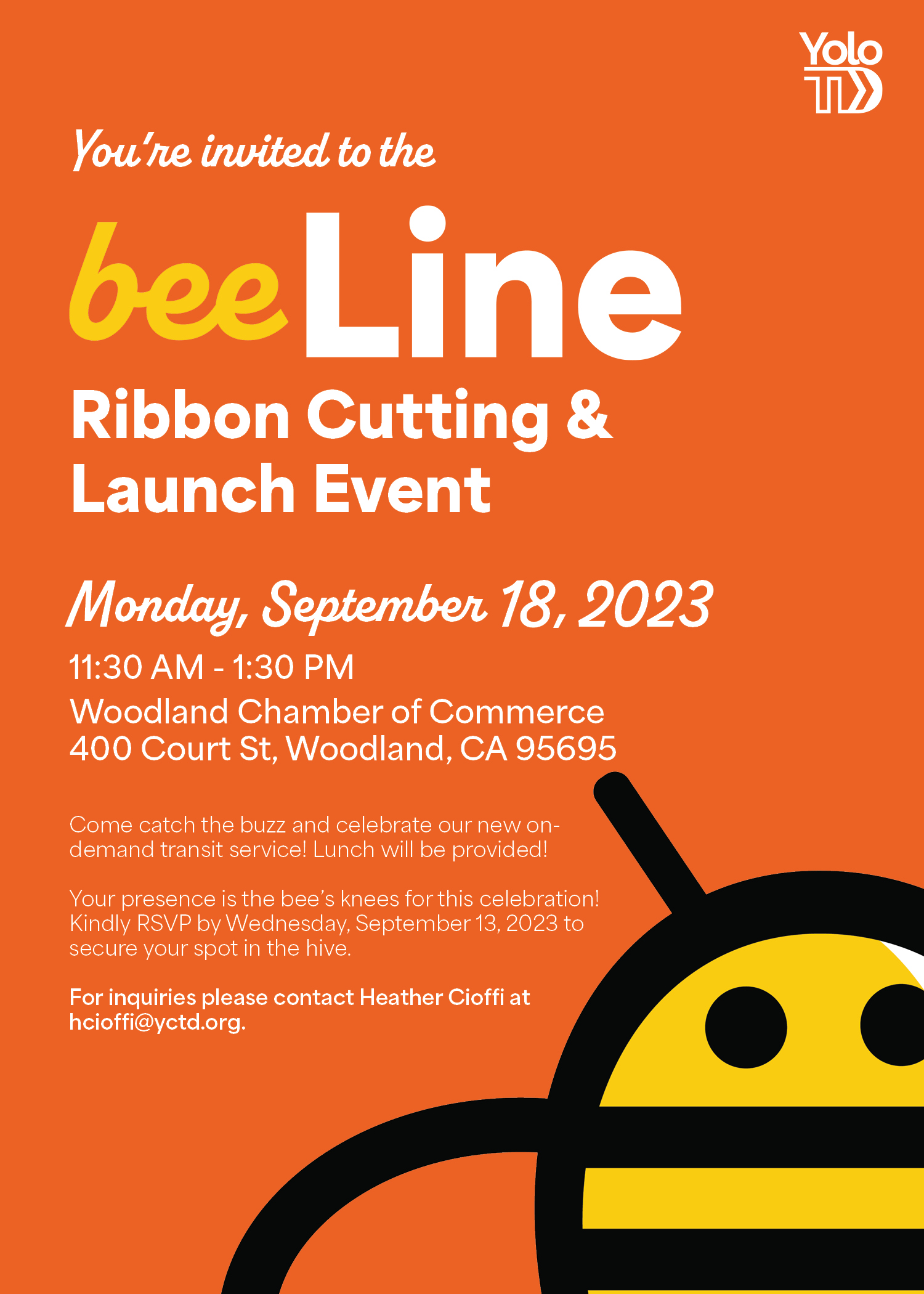 The YoloTD staff is buzzing with excitement to be launching our new service, BeeLine! To celebrate, we are hosting a ribbon cutting ceremony and launch event at the Woodland Chamber of Commence on Monday, September 18, 2023 from 11:30 AM-1:30 PM. Please join our staff and Board members to celebrate this amazing milestone!