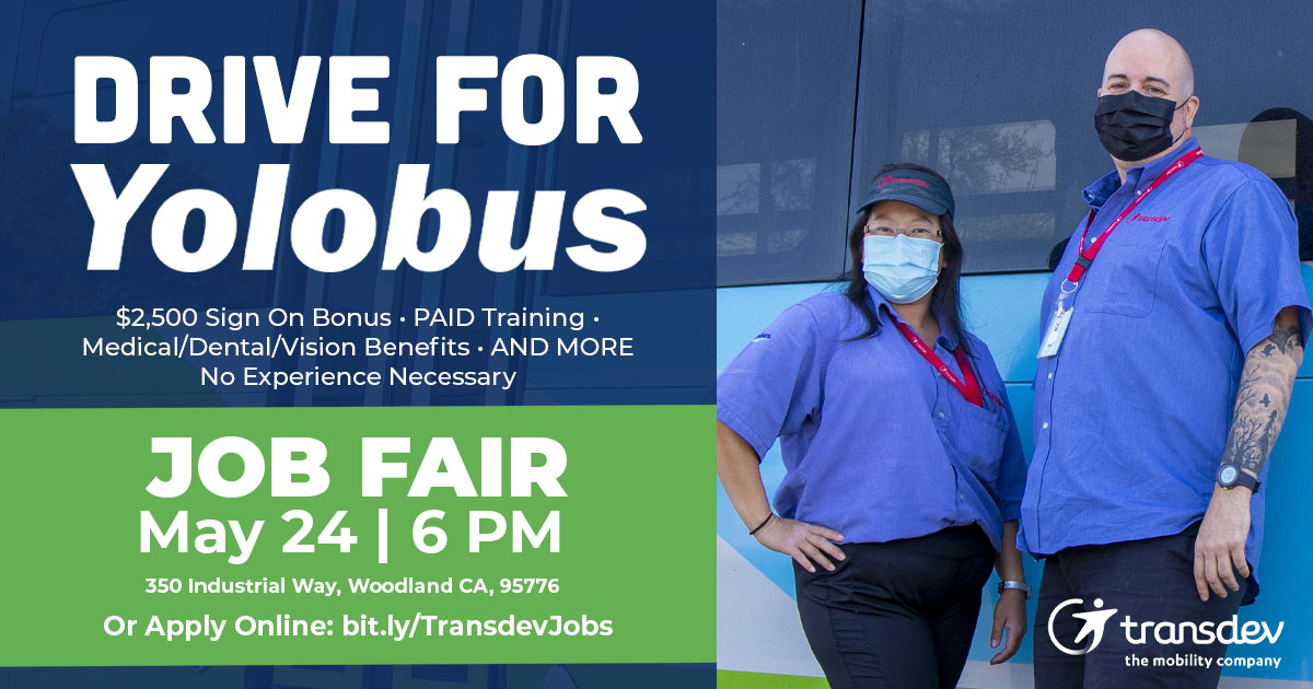 Transdev, the contractor for the operations of Yolobus is hosting a job fair on Wednesday, May 24 to fill several positions such as bus operators, operations supervisor, dispatchers/road supervisor, mechanic, and bus fueler/washer! Interested candidates should arrive at the YoloTD Office located in Woodland, California at 6:00 PM. Please be sure to bring a form of identification such as a Driver’s License, resume, and social security card.