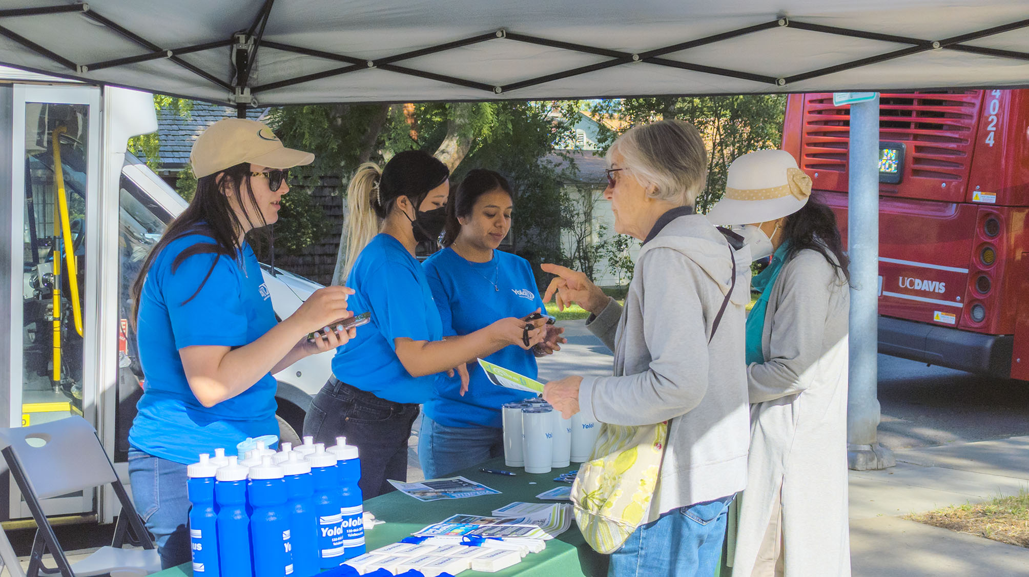 YoloTD staff, Sophia Linnevers, Pa Nhia Yang, and Hayary Torres teaching attendees of the City of Davis’ Travel Training event on Yolobus services and how to navigate the public transit system.