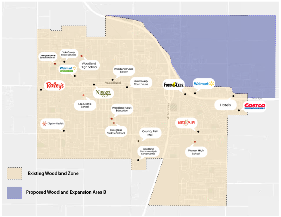 Yolo Transportation District (YoloTD) is looking to expand the BeeLine service area in Woodland to include the northeast area of Woodland (purple shaded area in map below).